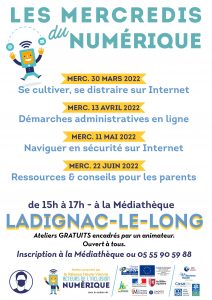 Pour toute question 05 55 90 59 88 ou par mail mediatheque@ladignaclelong.fr